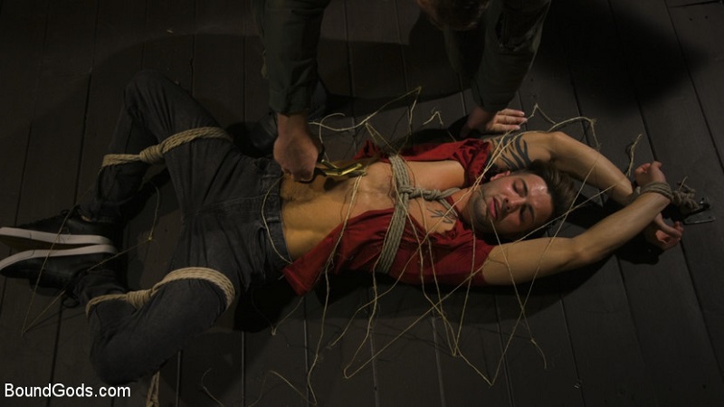 Pretty boy muscle stud Casey Everett wakes up in bondage. His limbs are spread and tied out of the way. Twine crisscrosses his body, wrapping him up like a prized piece of meat. He awakes to find his captor Colby Jansen watching from the shadows. Colby has been waiting a long time to get his hands on a perfect specimen like Casey. Colby takes his time cutting his new fucktoy's clothes off, exposing his hard abs, tight ass, and beautiful cock. Casey struggles in his bonds and screams for help, but he's not going anywhere. Colby stuffs Casey's underwear in his wet mouth and continues to finger his asshole and taste his beautiful cock. Casey loses himself in the struggle, his fight to escape making his cock rock hard. He asks to cum, but Colby isn't having it. He steps on Casey's cock with his heavy black leather boots, and then strings Casey up like a ballerina in a music box. Casey is blindfolded with his arms and a leg tied up so he must balance with one leg on a rotating platform. Colby flogs Casey on his back and ass before pushing Casey's mouth down around his rock hard cock. Casey chokes on Colby's fat cock, drooling leaking from around his lips. He works Colby's cock, taking it all the way to the balls. Next Colby ties Casey in a stress position, with his arms up, head down, and knees bent, and preps Casey's ass. He turns up the e-stim pads on Casey's ass. Casey moans as the electricity makes his muscles clench over and over. Colby sticks an acrylic plug in Casey's ass so he can see the pink insides of his boy, before sliding his cock deep into Casey's hungry hole. Casey moans as Colby pummels his ass. Once he's done, Colby cums hard all over Casey's face before leading him away for more fun.