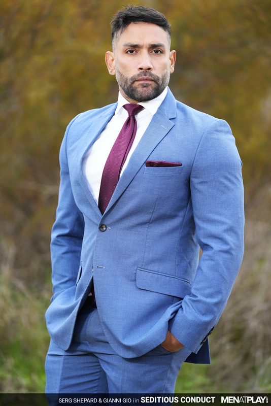Private First Class Serg Shepard is in open resistance to the government’s move to change the law that lets gay and bisexual men serve in the military. What better way to stand strong than to visit a known cruising spot in full uniform and play? Outdoors, Private Shepard pulls out his cock and gently strokes it until he hears a car pull up and a suited Gianni Gio appear. He confronts the sexy stud and makes sure that he’s not an undercover agent. Serg can tell right away that Gianni is out looking to play too - feeling his cock fully hard through his pants. He pulls it out and deep throats the Spanish cock, until Gianni services him. First, leaning against the car and then lying on a fallen tree trunk, Serg is fucked deep, hard, and raw by Gianni. With Giann’s cock still inside him, Serg shoots his load, followed by the suited Gianni squirting on Serg’s smooth ass. One act of defiance at a time!