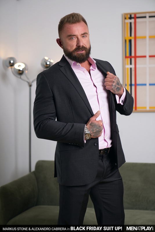 Not everyone gets Black Friday off from work, and Alexandro Cabrera is one of the unlucky ones who has to head into the office after a Thanksgiving social the day before. Suited and sipping his coffee before heading out, Alexandro is sitting when his roommate, Markus Stone, arrives home from a Black Friday shopping spree! Markus has purchased new suits, shirts, and ties, and can’t wait to show them to Alexandro. Markus undresses and begins to re-dress with his latest purchases when Alexandro warns him that the situation is getting “dangerous” (or too hot)! Seeing his friend suit up in front of him has turned up the heat, and both studs are ready to celebrate with a pre-work play session! After grabbing Markus’s crotch, the two men kiss passionately while Alexandro continues to jerk Markus’s cock through his pants and grab his meaty ass. Ready to suck on cock, Alexandro pulls Markus’s pants off, leaving him only in boxer shorts, pulls out the veiny cock, and sucks it hard and deep. Next is the time to enjoy rimming, fingering, and tie stuffing his friend’s smooth, muscular ass, getting it ready for a pounding. Before Markus can take Alexandro’s uncut Cuban cock, he deep throats the XXL monster meat. Markus sits on the hard cock in the cowboy position - his ass stretched when he fucks himself on Alexandro’s tool. Switching to the reverse cowboy position, he exposes his booty to Alexandro while riding him. Ready to cum, both studs sit on the sofa and finish each other and themselves off.