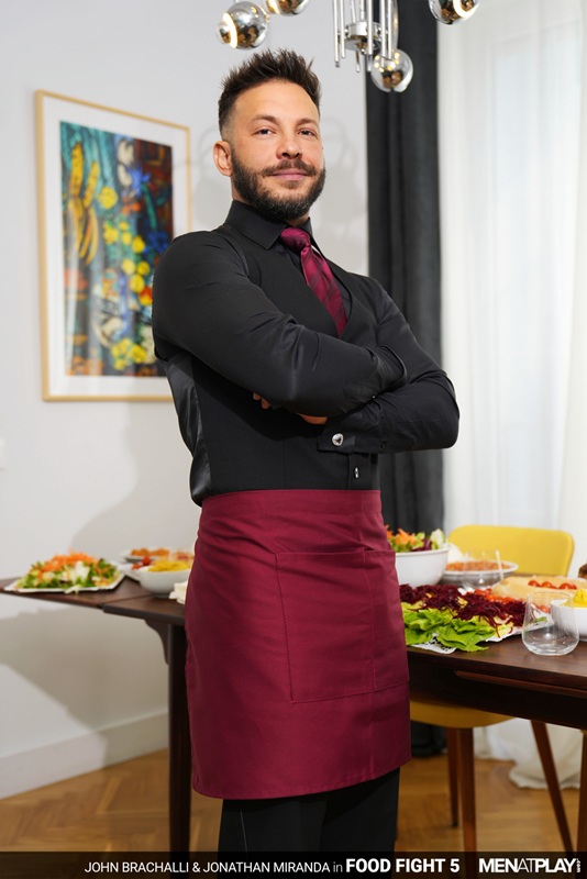 The Smith family is hosting a holiday dinner with friends and relatives, and to keep things smooth, they’ve hired a catering team to handle the meal. John Brachalli and Jonathan Miranda are in charge of setting the table, and John has a very particular way of doing things. While Jonathan’s bringing over a bowl of Dijon mustard, he accidentally bumps into John — sending mustard flying all over his uniform. Not thrilled about the mess, John snaps and starts a full-blown food fight. First, he dumps a salad on Jonathan’s head, then follows up with a splash of spaghetti sauce and pasta, turning the dining room into a chaotic, saucy battlefield. Silly banter turns to passion, and both studs get the perfect dessert – eating out ass and sucking on food-covered cocks before Jonathan shoves his thick cock inside John’s hole and fucks him raw. Maybe next year we’ll plan on doing dinner ourselves?! Bon Appetite.