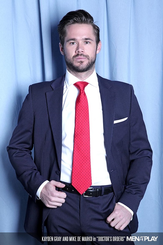 In the hierarchy of the hospital, Mike de Marko believes his position as senior surgeon entitles him to humiliate and mock eager young student doctors. But he's met his match this time when Kayden Grey attends his practical study session. With no patient available to analyse Dr. de Marko insists that Kayden sit in as the patient and proceeds to cut the trouser leg of Kayden's suit open up to his crotch to demonstrate assessment of a pelvic fracture. Kayden's naive demeanour is betrayed by a raging hardon that Mike de Marko attempts to deal with, at first professionally but then succumbs to his unprofessional desires. After deep-throating Kayden's huge dick, Kayden decides it's time to retaliate and cut the senior doctor's trousers making a hole just in the right place. Cocky Doctor de Marko not only gets his precious suit trashed but also gets pummelled hard by young Kayden's thick rod. We love seeing the tables turned like this, especially on cocky suited bosses who really deserve their comeuppance.