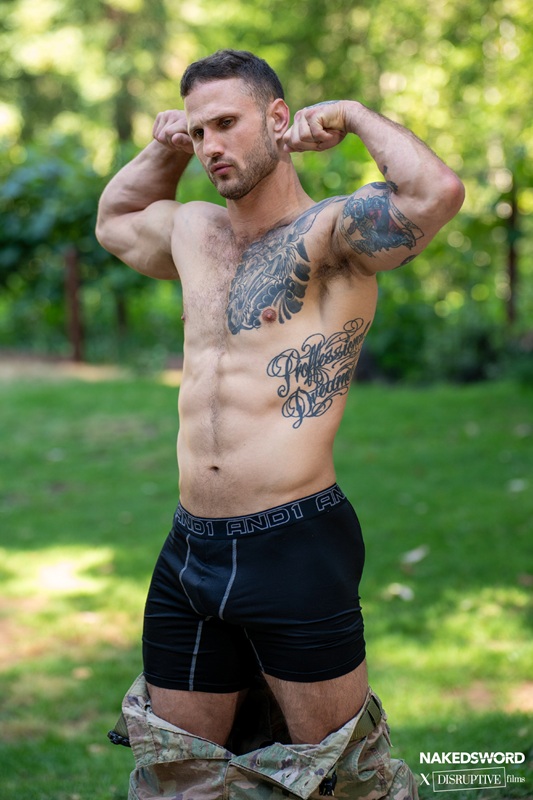 Blain O'Connor and Jacob King get together and they're so "excited" just chatting that they just do it on the sun porch. Blain plays right into Jacob's desire to be manhandled by flexing his guns for him, letting him suck him and then face-fucking him. And, just as Jacob wants, Blain bends him over in a rocking chair, eats out his ass and pounds it, quickly taking charge as verbal dom. Blain uses several power moves on Jacob: he moves the rocking chair to work his hole on his cock, then gets him on top and thrusts up into his hole every which way like a sex toy, and picks him up to fuck him in mid-air. Lastly, Blain drills the moaning bottom relentlessly until he shoots all over him and gets Jacob to cum too. And still, after wrapping it up with a kiss, Blain is still hard!