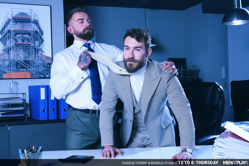 When you work the graveyard shift, it can get a little quiet and boring when you’re working alone. It’s Thursday night, and Charlie Cherry (the Customer Service Supervisor) is in his office while all his friends are out celebrating the long weekend. Alone and horny, Charlie takes out his phone and starts watching porn at his workstation. Through his pants, he takes his monster cock out and starts jerking off. Usually, customer service peaks on holidays, and Markus Stone, the Customer Service Director, stops by the office in case Charlie needs a hand. But the only hand Charlie needs is a good office suck and fuck - he orders Charlie to relax. Markus gets on his knees and sucks Charlie’s thick, uncut cock! To solve the situation like men, Charlie’s going to take care of his boss, too. He unbuttons Markus’ shirt and plays with his nipples and hairy, muscular chest before bending him over and sticking his tongue into his boss’s pink hole. Ready for a dicking, Charlie shoves his XXL cock into Markus and fucks him deep. When he’s ready to release his load, Charlie sits on his chair and jerks the cum out of himself. Markus follows next and cums all over Charlie’s suit to remind him who’s boss. It turns out Charlie really likes the night shift after all. Wouldn’t You?